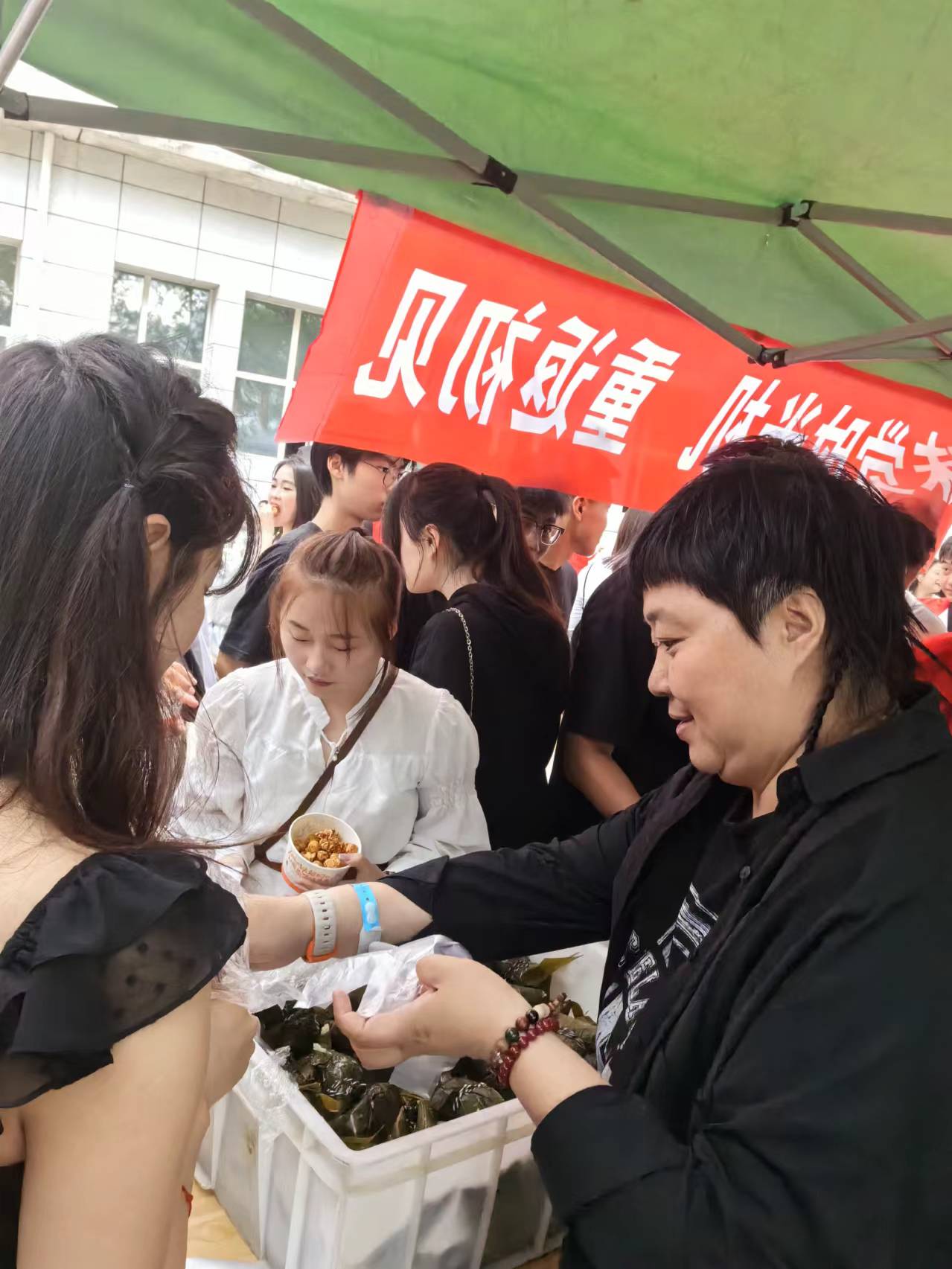活动现场总务处工作人员现场给学生分发粽子,学生非常高兴,对于总务处此次包粽子活动得到了学生和老师的一致认可和好评。