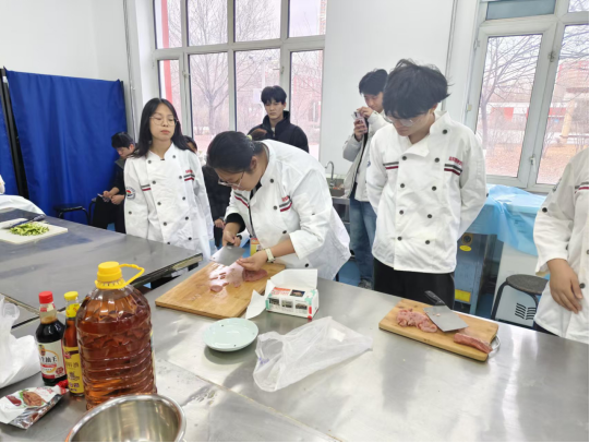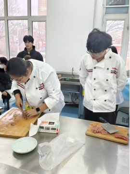 在课堂上,杨婷婷老师为了让学生有更直观的感受,向同学们展示了扎实的刀工,学生们认真观看并进行实际操作,获得新技能的同学们成就感满满。一位参与课程的学生表示:“这次菜肴制作课程让我学会了如何制作拔丝地瓜和精炼自身的刀工,更重要的是,我在实践中感受到了学习的乐趣和生活的美好。通过这门课程,我不仅提高了自己的动手能力,还学会了如何与团队成员合作,如何与家人分享快乐。
